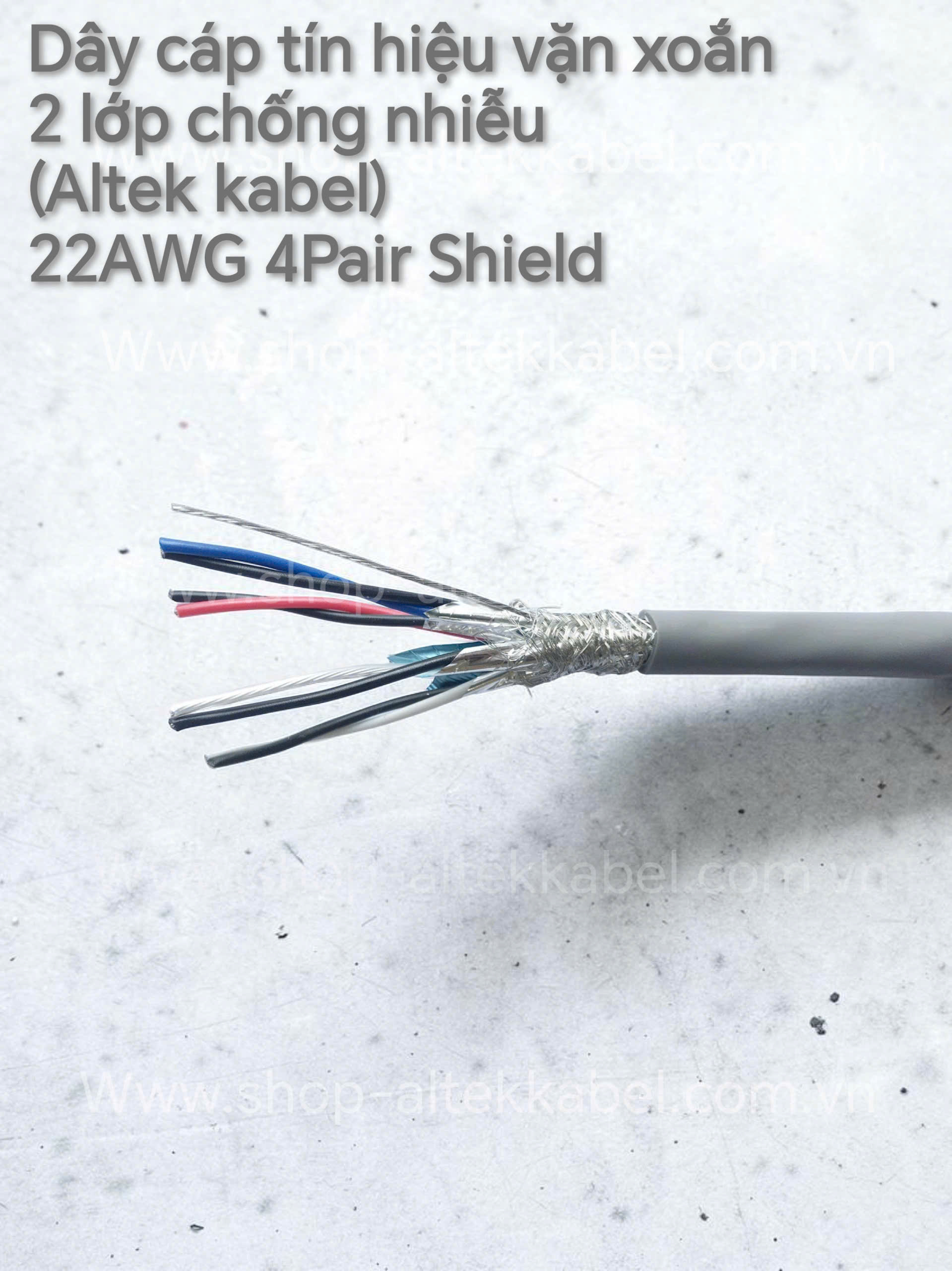 Dây cáp tín hiệu điều khiển vặn xoắn 2 lớp chống nhiễu Altek kabel 4Pair 22AWG được sử dụng lõi dẫn bằng đồng ủ mạ thiếc chống oxi hóa với lớp cách điện PE, 100% Nhôm Lá-Băng Polyester được bảo vệ từng cặp + lưới đồng mạ thiếc chống nhiễu tổng, Vỏ bọc ngoài bằng nhựa PVC, mầu xám chắc chắn, có thể chống chịu tốt các tác nhân từ ngoài môi trường, thích hợp với mọi môi trường trong nhà cho dự án công trình nhà máy và tòa nhà.